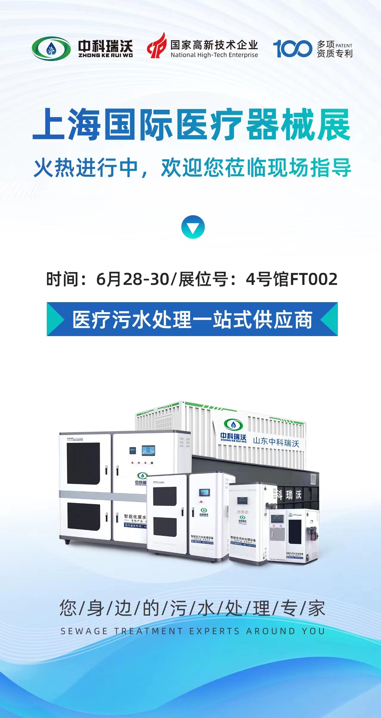 上海國際醫療器械展覽會將于6月28日-30日開展,為期三天,誠邀您蒞臨世博展覽館中科瑞沃FT002展位,我們將為您提供專業系統化的醫用污水解決方案!