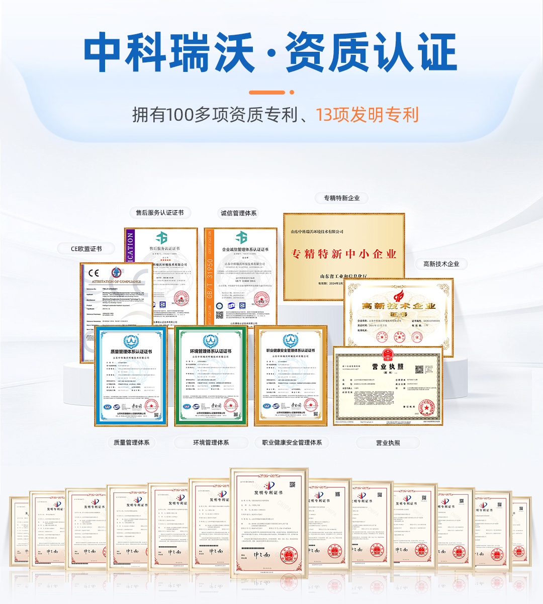 中科瑞沃堅持科技創新,科技研發實力強,有一支具備豐富一線經驗的研發技術團隊,近年來通過100多項國家實用新型及外觀設計專利;公司生產基地具備《消毒產品生產企業衛生許可證》,產品均在全國消毒產品網上備案信息服務平臺備案,而且都經過了第三方正規檢驗機構的檢測及歐盟CE認證,符合國家標準及國際標準,通過了ISO質量體系、環境管理體系、職業健康安全體系等多項認證。體現了公司在生產、管理、銷售和服務等各個環節規范化和體系化。并在2024年通過了國家高新技術企業認證,這標志著公司在研發和創新方面得到國家相關部門的肯定與認可。